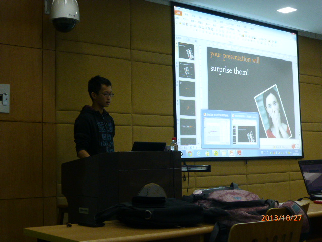 许同学将他要讲的内容分为动态PPT以及静态 PPT两块,首先,他从动画讲起。一个几十秒的求是潮纳新宣讲会PPT动画,虽然很多人都曾见过,但原来是单纯的欣赏,这次则是在专业人士的引导下对其进行剖析、理解。“相信初次看到这个动画的人都会或多或少的被其吸引甚至于震撼,但其实只要深入探究,便会发现其中的技术套路其实并不复杂,而且可以很清晰地进行分类。”接着他便对每张PPT的动画原理进行讲解,因为速度放的比较慢,大家也都可以拿出电脑亲手尝试,从许多同学透露出的恍然大悟的神色看来,这样的实践还是取得了很好的效果。