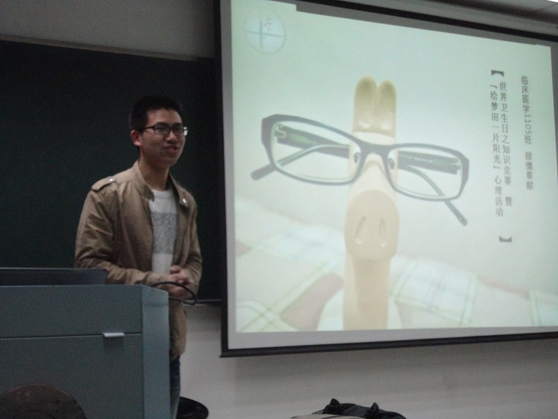 2014年4月7日晚上6:30,临床1105的同学欢聚西区空教室。一场名为“世界卫生日之知识竞赛暨‘给梦田一片阳光’心理活动”的班级主题生活会在此展开。团支部书记阮基浩主持了会议。